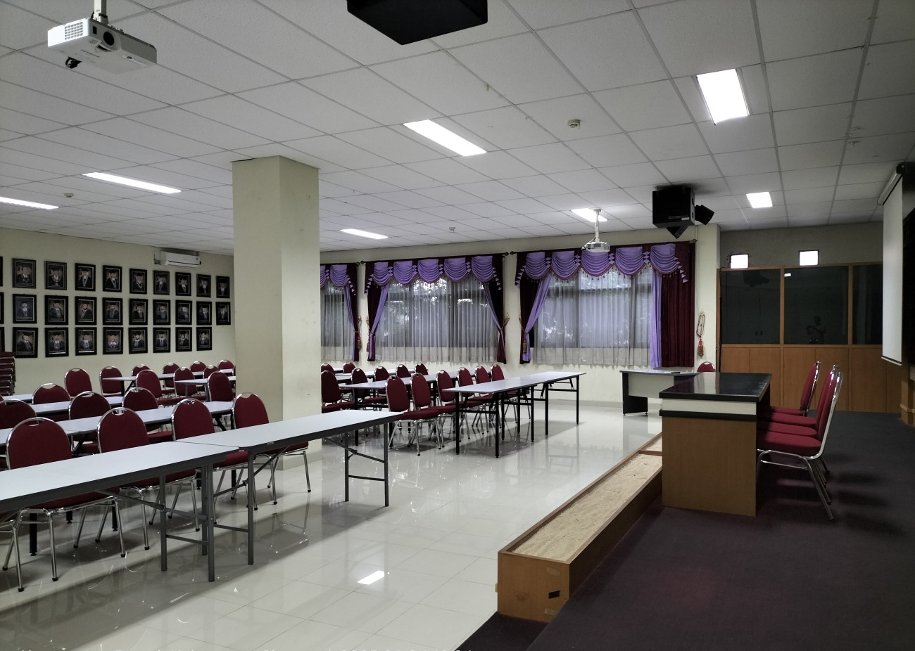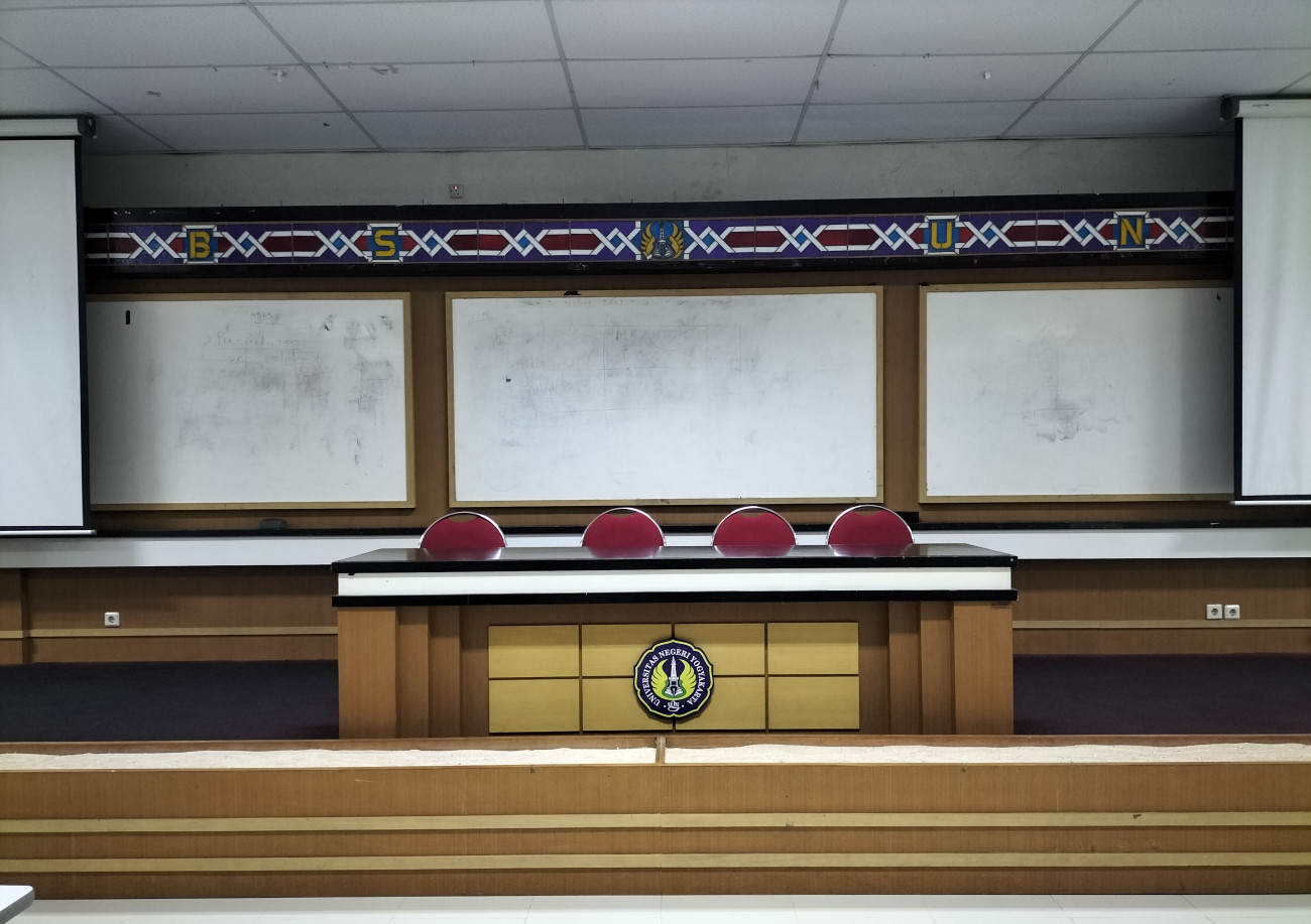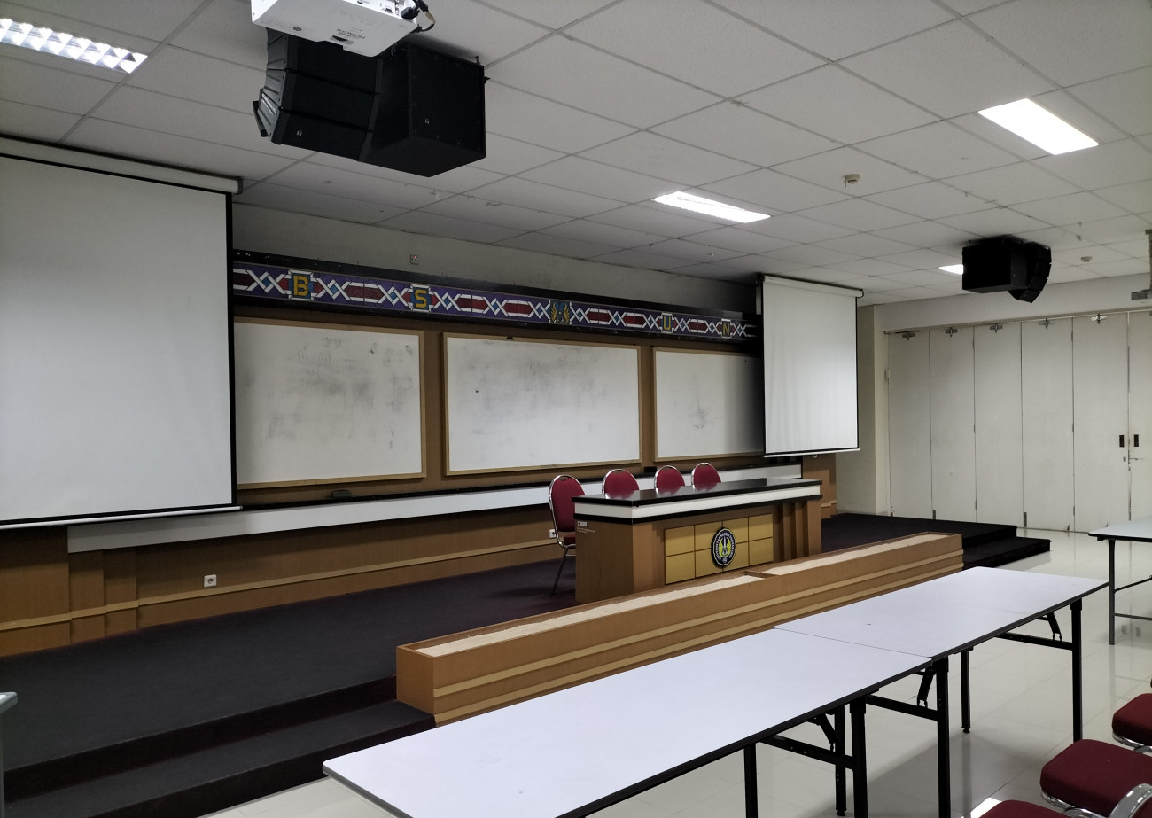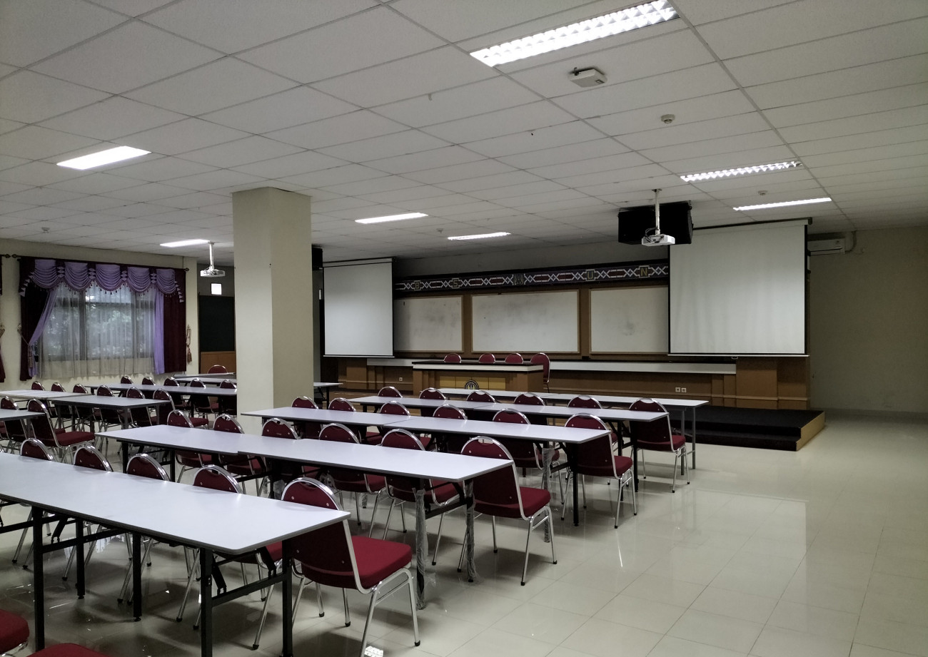 Fasilitas utama = AC Split: 4 buah; LCD Proyektor: 2 buah; Soundsystem standar dengan 4 mic: 1 set; Meja: 20 buah; Kursi beroda; 4 buah; Kursi hotel: 200 buah; Podium: 1 buah; Kursi tunggu: 15 set; Akses Wi-Fi Guest. Ruang berada di lantai 2 gedung W.S Rendra dengan akses menggunakan elevator/lift dan juga tangga. Fasilitas Pendukung = Meja presensi; Kursi presensi; Layar TV; Panggung; Mushola; Toilet P/W/D, Genset.